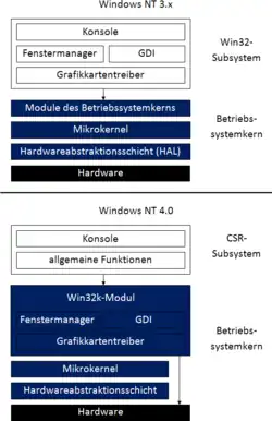 Der Weg, wie Daten auf dem Bildschirm ausgegeben werden, wurde jedoch grundsätzlich geändert. In vorherigen Versionen des Betriebssystems liefen die Grafikfunktionen als Teil des Win32-Subsystems im Benutzermodus. Dies hatte jedoch zur Folge, dass beim Aufrufen dieser Funktionen zahlreiche Kontextwechsel vorgenommen werden mussten, um zwischen dem Benutzer- und dem Kernelmodus zu wechseln, was sich negativ auf die Leistung des Betriebssystems auswirkte. Daher wurden in Windows NT 4.0 die Grafikfunktionen wie der Fenstermanager oder das Graphics Device Interface (GDI) in den Kernel verlagert, was die Grafikleistung des Betriebssystems spürbar erhöhte.[101] Lediglich die Konsolenfunktionen sowie weitere Funktionen, wie etwa das Erstellen von Prozessen, verblieben weiterhin im Benutzermodus.[100] Diese Änderungen glichen den Mehrverbrauch an Arbeitsspeicher, der durch die neue Benutzeroberfläche entstand, größtenteils aus. Als Folge davon ist es jedoch in Windows NT 4.0 möglich, dass fehlerhafte Grafikkartentreiber das gesamte System zum Absturz bringen. Diese Änderung ist eine direkte Folge der geänderten Philosophie im Designs des Betriebssystems. Waren anfangs noch alle Subsysteme gleichwertig und sich gegenseitig gleichgestellt, wird mit diesen Änderungen der besonderen Wichtigkeit von Win32-Anwendungen Rechnung getragen, indem die Ausführungsgeschwindigkeit dieser Anwendungen optimiert wird.[101]