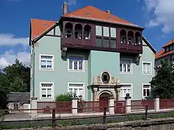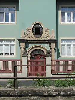 In der nahezu symmetrischen, fünfachsigen Straßenansicht steht mittig ein einachsiger Risalit mit einem aufwendigen Hauseingang. Das Sitznischenportal wird beidseits von Säulen begleitet, die ein starkes Gesims tragen. Auf diesem stehen über den äußeren Säulen Obeliske. Mittig zwischen diesen findet sich ein hochkant stehendes Ovalfenster, welches in den unteren zwei Dritteln von plastischen Ornamenten geschmückt wird. In den Zwickeln findet sich die Datierung ANNO DOM. 1903. Der Risalit verbreitert sich auf Höhe des Dachgeschosses zu einem Fachwerkerker von drei Achsen Breite. Die dort seitlich angesetzten rundbogigen Loggien unter einem Halbwalmdach werden an den Außenseiten von kräftigen Konsolen gestützt.