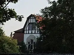 In der rechten Seitenansicht steht ein dachhoher Treppenhausrisalit mit dem Hauseingang. Auf Höhe des Dachgeschosses findet sich in diesem Risalit ein verandaartiger Austritt, darüber ist der Giebel mit Zierfachwerk geschmückt. Die Treppenhausfenster weisen Ornamentverglasung auf. Dort findet sich auch eine Datierung auf 1903.