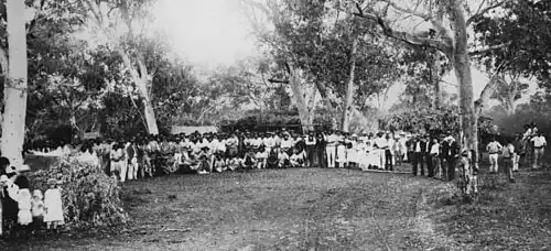 Zum Betreiben der arbeitsintensiven Zucker- und Baumwollplantagen im frühen Queensland wurden von 1863 bis 1903 etwa 60.000 melanesische Insulaner als sogenannte Blackbirded-Arbeiter auf Schiffen nach Queensland transportiert, wo sie drei Jahre dort arbeiten mussten.[12] Im Gründungsjahr des Commonwealth of Australia trat der Pacific Island Labourers Act vom 23. Dezember 1901 in Kraft. Dieses Gesetz brachte mit sich, dass die Administration von 1904 bis zum 31. Dezember 1906 etwa 7500 Insulaner in ihre Heimat repatriierte. Lediglich etwa 1600 von ihnen konnten in Queensland bleiben.[13][14][15] Führende Politiker von Queensland und New South Wales betonten seinerzeit, dass es für Asiaten und Farbige in Australien keine Zukunft geben würde.[16]