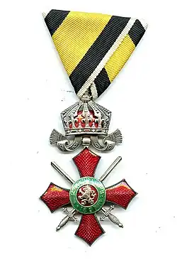 Für militärische Verdienste war das Ordensband gelb mit schwarzweißen Randstreifen und für Zivilverdienste weiß mit grünrosa Randstreifen. Seit 1915 waren dem Verdienstorden nach österreichischem Vorbild Lorbeerzweige als Kriegsdekoration hinzugefügt worden. Das Ordensband war dann hellblau mit silbernen Randstreifen.