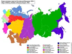 Anmerkung: das Jahr 1917 für das Ende des Bestehens von Militärbezirken und ihnen gleichgestellten Gebieten steht für das Ende des Bestehens der Kaiserlich Russischen Armee bzw. der Streitkräfte der Provisorischen Regierung. Die Kommandostrukturen dieser Bezirke bestanden in unterschiedlicher Form und Ausprägung je nach Gebiet bis zur Oktoberrevolution 1917 oder bis in die Zeit des beginnenden Russischen Bürgerkrieges 1918/1919, als sie sich schrittweise auflösten; offizielle Daten gibt es zumeist nicht.