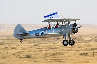 Die Boeing Stearman PT-17 Kaydet war einst Schulungsflugzeug der IAF-Flugakademie – hier ein weiterhin flugfähig gehaltenes Exemplar 2016 beim Kunstflug über der Chazerim Airbase