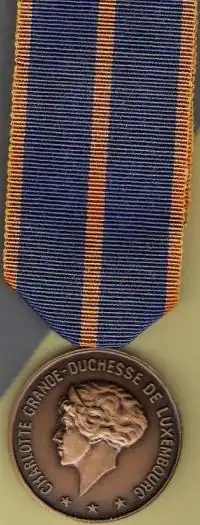 Die aus Bronze gefertigte runde Medaille zeigt das nach links gewendete Bildnis der Großherzogin mit der Umschrift CHARLOTTE GRANDE-DUCHESSE DE LUXEMBOURG. Unter dem Kopf sind drei fünfstrahlige Sterne nebeneinander zu sehen. Rückseitig das gekrönte luxemburgische Wappenschild sowie die durch den Wappenschild getrennte Jahreszahl 19 40 (Besetzung Luxemburgs).