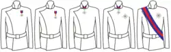 Als Aufhängung der Ordenszeichen der oberen drei Klassen dient ein Lorbeer- und Eichenlaubkranz, für Offiziere eine Trophäe in der Form einer Ritterrüstung, für Ritter ein einfacher Ring.