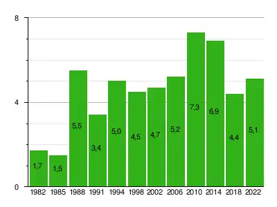 Die Grünen gingen aus der alternativen Bewegung, Umweltbewegung und der Anti-Atomkraft-Bewegung der 1970er Jahre hervor und organisierten sich als politische Partei 1981. Im Nachklang der Tschernobyl-Katastrophe, die Skandinavien teilweise stark betroffen hatte, gelang es den Grünen bei der Wahl 1988, die Vierprozenthürde zu überwinden und in den Reichstag einzuziehen.