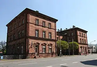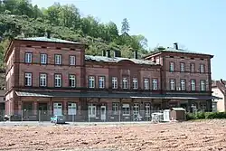 Das Empfangsgebäude im spätklassizistischen Stil erhielt eine Verblendung aus rotem Mainsandstein[1]. Nachdem der Personenbahnhof verlegt worden war, diente das Empfangsgebäude zunächst der örtlichen Bahnmeisterei und als Wohngebäude für Bahnbedienstete. Nach einer Ausschreibung gelangte das Gebäude 1981 an einen Investor, der die Wohnungen in Mietwohnungen umwandelte. Das imposante Empfangsgebäude ist ein Kulturdenkmal nach dem Bayerischen Denkmalschutzgesetz.