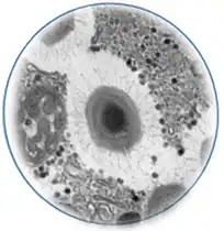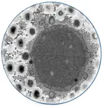 TEM-Aufnahme der Virusfabrik (dunkler Kreis, Durchmesser 4,5 µm) von APMV, 8 Stunden nach der Infektion von Acanth­amoeba castelanii. Die Virionen zeigen einen dunklen, elektronen­dich­ten Kern und Filamente.[22]