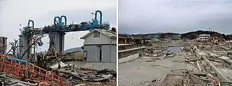 Der durch das Tōhoku-Erdbeben am 11. März 2011 verursachte Tsunami traf dann die Bevölkerung in seiner Höhe unerwartet, zumal die erste Tsunamiwarnung für die Präfektur Miyagi eine Höhe von drei Metern vorausgesagt hatte.[7][A 5] Doch während die durchschnittliche Höhe vorangegangener Tsunamis in Minamisanriku über 5 m gelegen hatte, wird die maximale Höhe des Tsunamis von 2011 in der Stadt mit über 10 m für einige Gebiete angegeben.[7] Höhe und die Fläche der Überflutung übertrafen in Minamisanriku bei weitem sowohl die erlebten Werte des Chiletsunamis von 1960 als auch die auf Grundlage des vorausgesagten Miyagi-ken-oki-Erdbebens (mit einer Magnitude von etwa 7,4 und einem Wiederholungsintervall von weniger als 40 Jahren) erwarteten Werte.[3]