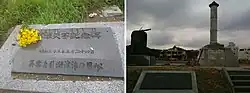 Am 11. März 2011 im Tsunami zerstörte Stein-Mahnmale für den Shōwa-Sanriku-Tsunami (links; die Inschrift mahnt, „vorsichtig vor einer ungewöhnlich zurückweichenden Welle zu sein“) und den Chile-Tsunami 1960 (rechts; zerstörte Moai-Statue und Kondor-Säule) (Fotos: 25. März 2011)[19]
