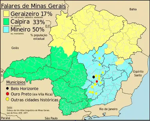 Es wird in seiner Hauptstadt Belo Horizonte und seinen historischen Städten gesprochen: Ouro Preto (Hauptstadt 1720–1897), Mariana (erste Stadt), Santa Bárbara, Sabará, Diamantina, Tiradentes, São João del-Rei, Congonhas, Caeté, Itabira, Serro usw.