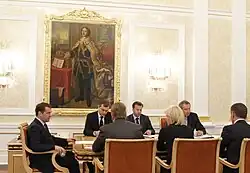 Der russische Ministerpräsident 2012 mit sechs seiner Stellvertreter: Dmitri Medwedew, Igor Schuwalow, Wladislaw Surkow, Arkadi Dworkowitsch, Olga Golodez, Dmitri Rogosin, Dmitri Kosak (von links nach rechts)