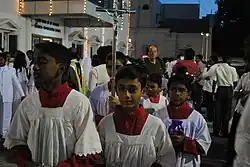 Bei feierlich gestalteten Gottesdiensten tragen Ministranten als Thuriferar das Weihrauchfass und als Navikular das Schiffchen.[5] Als Ceroferare tragen sie Kerzen und Leuchter, als Kruziferar das Vortragekreuz.[6] Sie tragen das Weihwassergefäß mit dem Aspergill und reichen es dem Priester oder Diakon an (Weihwasserträger). In Pontifikalämtern halten sie als Mitrafer und Baculifer Mitra und Stab des Bischofs, solange er diese Insignien nicht benötigt. Vielerorts übernehmen Ministranten auch das Tragen von Vortragefahnen. Erfahrene Ministranten amtieren in größeren Gottesdiensten als Zeremoniare.