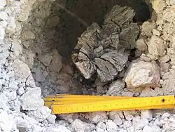 Einige neuere 14C-Datierungen sprechen wiederum für die Jahre 1620 bis 1600 v. Chr.: Die 2006 gelungene Radiokohlenstoffdatierung des Astes eines vom Vulkanauswurf begrabenen Olivenbaums auf Thera,[48] der im November 2002 in der Bimsschicht der Insel gefunden wurde,[49] ergab ein Alter von 1613 v. Chr. ± 13 Jahre.[50] Der Nachweis von Blättern zeigt, dass der Ast lebend durch den Ausbruch verschüttet wurde. Dabei wurden erstmals die einzelnen Jahresringe des Astes einzeln 14C-datiert und durch deren bekannte Zeitabstände die Konfidenzintervalle erheblich reduziert.[51] 2007 wurden ein weiteres Stück desselben Astes und ein zweiter, längerer und oberflächlich verkohlter Ast mit mehreren Seitenzweigen in nur neun Meter Entfernung vom ersten Fundort entdeckt, die bisher nicht datiert wurden.[52] Gegen die Ergebnisse wurden Einwände erhoben, weil Olivenbäume keine ausgeprägten Jahresringe ausbilden,[53][54] woraufhin die Autoren der Datierung darauf verwiesen, dass ihr Ergebnis auch ohne die Konfidenzintervalle, nur als gesicherte Abfolge der Proben, weiterhin eindeutig sei.[55]