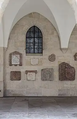 Unter den Arkaden an der Südseite der Kirche befinden sich Reste von Grabsteinen, die von den ursprünglich im Umfeld des Minoritenklosters beigesetzten Persönlichkeiten künden.[28]