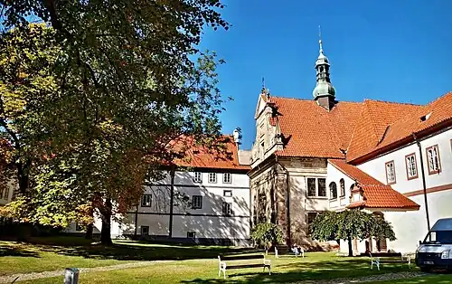Im Kreuzgang sind spitzbogige Fenster mit gotischem Maßwerk erhalten. Im zweischiffigen Nordflügel des Kreuzgangs tragen gedrehte Mittelsäulen das Netzgewölbe. Die östlich angebaute Kapelle des heiligen Wolfgang wurde am 16. September 1491 von Benedikt von Waldstein, Bischof von Cammin, geweiht und diente auch als Kapitelsaal. Die Rokokomalereien mit Szenen aus dem Leben des heiligen Wolfgang wurden 1781 von Jan Václav Tschöpper geschaffen.[3] Im Innenhof des Kreuzgangs ließ Marie Ernestine von Eggenberg 1687–1688 die Kapelle der schwarzen Madonna von Maria Einsiedeln erbauen.