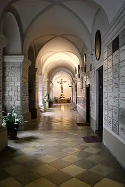 Im Kreuzgang sind etwa 4300 Votivtafeln[2] und zwei Gedenktafeln an Opfer des Nationalsozialismus angebracht. Eine ist zu Gedenken an den Profeß-Kleriker der österreichischen Minoritenprovinz Peter Blandénier. Die zweite Gedenktafel wurde vom Anrather Kreis 1949 gespendet und gedenkt an Bernhard Burgstaller (Abt), Richard Hanns Färber (Oberleutnant), Gerhard Fischer-Ledenice (Diplomkaufmann), Adolf Gubitzer (Löschmeister im Burgtheater), Hanns Georg Heintschel-Heinegg (Theologe), Heinrich Hock (Beamter der Ravag), Jakob Kastelic (Rechtsanwalt), Karl Lederer (Regierungsreferendar), Günter Josef Loch (Schriftsteller), Alfred Adalbert Miegl (Beamter der Wiener Elektrizitätswerke), Marie Schlagenhauser (Geschäftsfrau), Roman Karl Scholz (Theologieprofessor), Rudolf Wallner (Beamter der Wiener Elektrizitätswerke) und Hans Ferdinand Zimmerl (Rechtsanwaltanwärter).[3] Weiters ist an der Südseite des Kreuzganges in einer Nische eine Gedenkstätte für den im KZ Auschwitz ermordeten Minoritenpater Maximilian Kolbe eingerichtet, die von Ernst Degasperi gestaltet wurde.