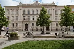 Aufgrund des zunehmenden Bedarfs nach einer Schule im Neustadtbereich beschloss man 1889 die Errichtung einer solchen. Das Schulgebäude wurde vom Salzburger Stadtbauamt geplant, unter Valentin Ceconi errichtet und am 11. September 1893 fertiggestellt.[41] Dagegen geben Hoffmann und Krejs eine Bauzeit von 1891/92 an.[42] Hier werden auch die nachfolgend genannten Baukosten angegeben. Schobersberger gibt überhaupt das Jahr 1900 als Fertigstellungstermin an.[43] Als Baukosten werden 563.900 Kronen angegeben, was einem Gegenwert von knapp 4,1 Mio. Euro entspricht.[44] Wenige Tage nach Fertigstellung nahmen darin die Knaben- und Mädchenvolksschule St. Andrä und die Knabenbürgerschule St. Andrä ihren Betrieb auf. Während des Ersten Weltkriegs war ein Lazarett im Gebäude untergebracht, die Schüler wurden bis 1919 in einem anderen Schulgebäude in der nahen Paris-Lodron-Straße unterrichtet. Umgekehrt mussten während des Zweiten Weltkriegs Schüler der weiter entfernten Plainschule in der Elisabeth-Vorstadt im Bürger- bzw. Hauptschultrakt an der Haydnstraße unterrichtet werden, da das Schulgebäude in der Plainstraße 1939 von der NS-Wehrmacht in Beschlag genommen worden war. Bei Bombenangriffen gegen Kriegsende wurde der Haydnstraßentrakt schwer getroffen, nach dem Krieg waren zeitweise ehemalige Kriegsgefangene dort untergebracht.