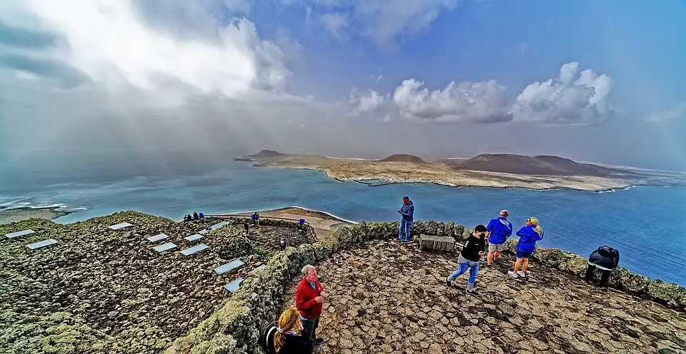 Der weitreichende Blick über die Felsklippen und über die etwa zwei Kilometer breite, namensstiftende Meerenge Río (spanisch für Fluss) hinüber bis auf den Chinijo-Archipel, mit den Inseln La Graciosa, Alegranza, Montaña Clara, und dem Felsen Roque del Este, machten das Mirador del Río zu einer Touristenattraktion. Am Fuße des Abhangs (Risco de Famara), mit seinen im Laufe von Jahrtausenden entstandenen bizarren Auswaschungen, befindet sich eine der ältesten Salinen der Kanaren. Das eigenartige Rot einiger ihrer Segmente ist auf den winzigen Salinenkrebs zurückzuführen. Westlich an die Salinen angrenzend sieht man den weißen Playa del Risco. Er ist nur per Boot oder über einen serpentinenreichen Wanderweg die Steilwand herab zu erreichen.