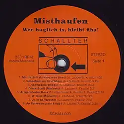 - ↑ a b c d e f g h i Die MC Hit aus Wien – „Misthaufen“ & Erhard Busek („PRO WIEN“) wurde zur Wiener Gemeinderatswahl 1978 als Wahlkampfmittel verteilt. Das Album umfasste acht Titel der Gruppe: Seite 1: „Im Park is schee“, „Nägelbeißa-Boogie“, „I haaß Latta“, „Ja in da Vorstadt“; Seite 2: „Atzgersdorfer Rock“, „An Schweinsbratn kria i“, „Im Prata“, „Schabernack“. Dazwischen Kommentare von Busek.