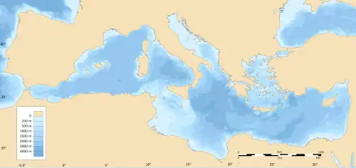 Das Mittelmeer (lateinisch Mare Mediterraneum),[1] auch Mittelländisches Meer oder Europäisches Mittelmeer, im Römischen Reich Mare Nostrum („Unser Meer“) genannt, stellt ein Mittelmeer zwischen Europa, Afrika und Asien dar. Es kann als Nebenmeer des Atlantischen Ozeans aufgefasst werden beziehungsweise als Binnenmeer, da es mit der Straße von Gibraltar nur eine sehr schmale Verbindung zum Atlantik hat. Im Arabischen (البحر الأبيض DMG al-baḥr al-abyaḍ) und im Türkischen (Akdeniz) wird es auch als „Weißes Meer“ bezeichnet.