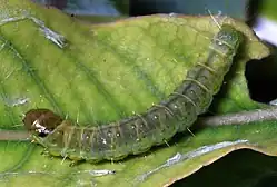 Die jüngeren Raupen sind hellgelb, später färben sie sich gelbgrün bis grün. Im letzten Raupenstadium sind sie olivgrün mit einem gelben oder braunen Kopf und Nackenschild. Sie erreichen eine Länge von 23 mm.