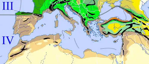 Der Raum um die Obere Adria wird bereits in die gemäßigte Zone gerechnet. In der Po-Ebene, in Venetien und an der slowenischen Küste tritt keine geschlossene Trockenperiode mehr auf, obwohl die Temperaturen auch dort mild ausfallen.