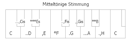 - Elf mitteltönige Quinten: Es-B, B-F, F-C, C-G, G-D, D-A, A-E, E-H, H-Fis, Fis-Cis, Cis-Gis