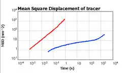 Die mittlere quadratische Verschiebung ist auch experimentell zugänglich. So kann sie etwa durch Single-Particle-Tracking-Techniken direkt aus den dort gemessenen Trajektorien bestimmt werden.[7][8] Auch mit Hilfe von Fluoreszenz-Korrelations-Spektroskopie ist sie unter gewissen Annahmen experimentell zugänglich.[9] Aus der gemessenen Kurve ⟨r²(τ)⟩ kann dann auch der Diffusionskoeffizient bestimmt werden: