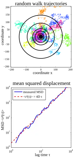 Als Beispiel betrachtet man eine reine Brownsche Bewegung in zwei Dimensionen (vgl. Abbildung rechts). Lässt man mehrere Teilchen (in der oberen Teilabbildung in verschiedenen Farben) am gleichen Ort starten, so bewegen sich zwar einzelne Teilchen vom Startpunkt weg, aber jeweils in unterschiedliche Richtungen. Auch kann jedes Teilchen durchaus zum Startpunkt zurückkehren. Mittelt man nun über alle Teilchenpositionen nach einer Wartezeit τ, so wird dieser Mittelwert wieder nahe dem Startpunkt liegen, die Teilchen haben sich also im Mittel nicht fortbewegt. Hätten die Teilchen im Gegensatz dazu eine Vorzugsrichtung, so würde sich auch ihr Mittelwert mit einer gewissen Geschwindigkeit in diese Vorzugsrichtung bewegen.