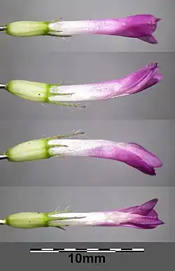 Die zwittrige[2] Blüte ist zygomorph und fünfzählig mit doppelter Blütenhülle. Die fünf Kelchblätter sind verwachsen. Der selten im oberen Bereich mit ausgebreiteten Trichomen behaarte, verkahlende und meist auch außen kahle, grünlich-weiße Kelch ist meist zehnnervig[1] (selten zwanzignervig) und durch einen zweilippigen, behaarten Ringwulst fast geschlossen.[4][5] Die fünf fadenförmigen Kelchzähne sind mehr oder weniger dicht bewimpert und ungleich lang.[5] Die meist 15 bis 18 (12 bis 20) Millimeter lange Krone ist hell-purpurrot, sehr selten auch weiß und besitzt die typische Form einer Schmetterlingsblüte.[4][5] Kronblätter und Staubblätter sind zu einer 8 bis 9 Millimeter langen Röhre verwachsen.[5]