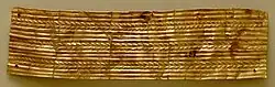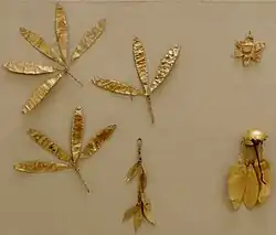 Im neuen Jahrtausend kam es zu mehreren Grabungskampagnen in den Jahren 2004–2006, 2009–2010 sowie 2012.[63] Dabei konnten erneut bemerkenswerte Funde geborgen werden. Bereits 2004 entdeckte man in Haus B.2 einen Barren aus Zinn, einen teilweise über diesem liegenden bronzenen Dreizack und einen kompletten Ochsenhautbarren.[65] Der Dreizack besitzt Widerhaken, was eine Funktion zum Fischfang vermuten lässt.[66] In Haus C.3 wurde 2005 ein bronzenes Sistrum aus der Phase SM I B ausgegraben, das sich heute im Archäologischen Museum von Agios Nikolaos befindet.[67] Die Rahmenrassel ist 28,5 cm hoch und 8,3 cm breit.[68] Sistren sind vor allem aus dem alten Ägypten bekannt, wurden jedoch vereinzelt auch auf Kreta gefunden. Ein weiteres Sistrum aus Bronze stammt aus Agia Triada. In Phourni bei Archanes und der Höhle von Agios Charalambos an der Westseite der Lassithi-Hochebene fand man mittelminoische Sistren aus einheimischem Ton.[69] Die bildliche Darstellung eines Sistrum befindet sich auf der Schnittervase aus Agia Triada.[68]