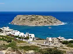 Die etwa 300 × 250 Meter große und 62 Meter hohe Felseninsel Agios Nikolaos ist nach der kleinen Kirche auf der Südseite benannt, die Nikolaus von Myra geweiht ist. Sie befindet sich in einer Entfernung von 180 Metern vor der Nordküste Kretas. Dort entstand nach der Entdeckung der altertümlichen Hafensiedlung im Jahr 1907 der kleine Ort Mochlos, dessen Name auch für die Insel verwendet wird.[1] In venezianischer Zeit hieß die Insel Scoglio de Muflo. Mitunter wird sie auch Psyllos (ΨύλλοςFloh‘) genannt, im Gegensatz zur Insel Psira (ΨείραLaus‘) 3,2 Kilometer westlich.[2] Die Ausgrabungsstätte nimmt überwiegend den südlichen Bereich der Insel um die Kirche ein, einige Grabbauten liegen oberhalb der Westküste. In der Bronzezeit scheint eine Landverbindung mit Kreta bestanden zu haben, eine Halbinsel bildend mit zwei Häfen zu beiden Seiten der schmalen Landenge.[3]