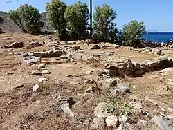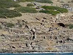 Die späthellenistische Siedlung erstreckte sich auf der Südseite der heutigen Insel über die gesamte Fläche der früheren minoischen Bebauung und war im Norden, Osten und Süden von einer Ringmauer umgeben. Von Westen war sie durch die Klippen geschützt.[31] Neben Wohngebäuden gab es auch Produktionsstätten,[32] wie in dem etwa 23,5 Meter langen Späthellenistischen Gebäude I, das mit seinen acht Räumen südlich außerhalb der Ringmauer lag. Es beherbergte in den Räumen 1 und 6 zwei Balkenpressen, von denen die im östlichen Raum 1 wahrscheinlich bei der Textilherstellung verwendet wurde. Der Raum mit der Ölpresse, Raum 6, war der größte des Gebäudes.[33]