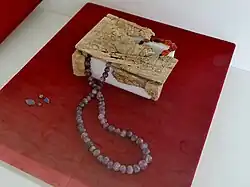 Einen der seltensten Funde in der Geschichte der minoischen Archäologie stellt eine Pyxis aus Elefantenelfenbein aus der Phase SM I B dar,[66] die 2010 in Block A (Area 4) zusammen mit 10 Haarnadeln aus Elfenbein gefunden wurde.[74] Die Pyxis misst 11 × 14 cm und besitzt einen Holzboden. Die Seiten, wie der Deckel aus Elfenbein, zeigen das Flachrelief einer Meereslandschaft. In den Pyxisdeckel ist ein Bild eingearbeitet, das die Epiphanie der minoischen Göttin wiedergibt. In einer Veröffentlichung vom Oktober 2023[75] wird die Darstellung auf der Pyxis neu gedeutet: Bisher unentdeckte Haarsträhnen, anatomische Details, die Kleidung und Attribute ermöglichen eine Nachbildung der Figuren. Es spricht gegen die Behauptung von SOLES, dass die Göttin eine Lilie hält, um den kleineren Mann zum König zu krönen, und dass der führende Mann ein Held oder Gott ist. Stattdessen wird festgestellt, dass die Göttin einen Olivenzweig hält, und die Komposition die Ikonographie in altsyrischen Gemälden und Glyptik widerspiegelt, einschließlich eines Siegels, das tatsächlich in Mochlos gefunden wurde. Gestützt durch ikonografische und textliche Beweise schlägt diese Studie vor, dass das aus dem Nahen Osten übernommene und adaptierte Ritual einen minoischen Herrscher darstellt, der der Göttin ein Gefäß für ihren Segen für das Paar anbietet, was möglicherweise eine dynastische Hochzeit markiert, und dass die Pyxis und die darin gefundenen Schmuckstücke Brautgeschenke waren. In der Pyxis lagen 80 Amethystperlen, viele davon in situ, wobei noch Spuren der Schnur erhalten blieben, so dass zwei Halsketten identifiziert werden konnten, eine aus kleinen, die andere aus größeren Perlen. Weiter fanden sich Karneolperlen, Glaspasten und Perlen aus Lapislazuli in verschiedenen Formen.[76]