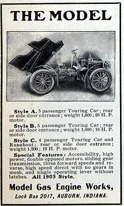 In den vorhandenen Quellen wird die Geschichte des Unternehmens in abweichenden Details dargestellt. Die Wurzeln gehen zurück auf die 1890er Jahre[3], als in Garrett (Indiana) eine mechanische Werkstätte eingerichtet wurde, die wahrscheinlich auch Verbrennungsmotoren herstellte. Erst am 11. Oktober 1900 wurde das Unternehmen formell gegründet.[4] Bereits einen Monat später zog die Model Gas Engine Company um nach Auburn (Indiana). Das Domizil lag an der Kreuzung South Main Street und Ensley Street.[4] Nach einer Darstellung[5] ging das Unternehmen bereits 1901 in den Besitz des jungen Rechtsanwalts[5] Edward A. Myers[4] über, der es zufolge einer Quelle als Model Gas & Gasoline Engine Company[5] führte. Model bot zunächst eine wachsende Palette an Verbrennungsmotoren an, vor allem in einer Vielzahl von Stationär- und Fahrzeugmotoren. Bereits 1902[5] oder 1903[6] folgte die Produktion von Automobilen.
