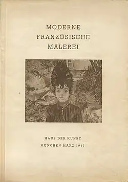 Die von der französischen Direction de l’Education Publique, Sous-Direction des Beaux-Arts organisierte Ausstellung stand unter der Schirmherrschaft des Brigadegenerals Walter J. Muller, US-amerikanischer Militärgouverneur von Bayern, des französischen Generalkonsuls in München Louis Jousset und des Bayerischen Ministerpräsidenten Hans Ehard statt.[40] Zur Ausstellung erschien erneut ein eigener Katalog, dessen Vorwort von Jean Cassou abermals aus den vorangegangenen Stationen stammte. Neu war der Einführungstext München und das Französische, den der Kunsthistoriker Wilhelm Hausenstein verfasst hatte. Er erinnerte an die langen kulturellen Verbindungen zwischen Frankreich und Bayern und spannte dabei den Bogen vom Münchener Barockschloss Nymphenburg und dessen französischem Vorbild Versailles über die I. Internationale Ausstellung von 1869 im Münchner Glaspalast, wo unter anderem Werke des Franzosen Gustave Courbet zu sehen waren, bis zur Tschudi-Spende, mit der vor dem Ersten Weltkrieg bedeutende Werke der französischen Moderne in die Sammlung der Neuen Pinakothek gelangten.[40] Eine große Gruppe von Werken diese Stiftung wurde als Erweiterung der Ausstellung im Haus der Kunst gezeigt, die ansonsten der Ausstellung in Wien entsprach. Der von der Bayerischen Staatskanzlei herausgegebene Katalog war nur in deutscher Sprache verfasst, das Verzeichnis der Werke hatte französische und deutsche Bildtitel. Auf einen Anhang mit Abbildungen wurde verzichtet, das Titelbild war erneut die Berthe-la-sourde von Henri de Toulouse Lautrec.[40]