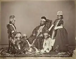 - ↑ Annemarie Schimmel: Im Reich der Großmoguln; S. 14–15; über Babur: „Sein [Baburs] Vater war Mirza Omar Shaykh, in direkter Linie von dem großen Timur abstammend. […] Baburs Mutter war die Tochter Yunus Khan Moguls, einem Nachfahren Chingiz Khans“. J.B. Harrison, P. Hardy: BĀBUR, Ẓāḫīr al-Dīn Muḥammad; in: Encyclopaedia of Islam, digitale Edition