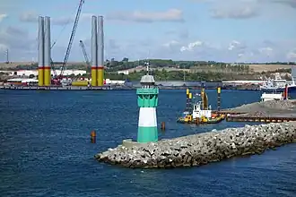 Der achteckige und 14 Meter hohe Betonturm wurde 1995 auf dem Kopf der Hafenmole errichtet. Das grün-weiß-grüne Molenfeuer markiert die Steuerbordseite der Hafeneinfahrt und zeigt als Kennung ein grünes Gleichtaktfeuer mit einer Wiederkehr von vier Sekunden (Iso.G.4s). Über der Laterne ist eine Radarantenne montiert.