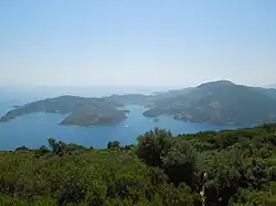 An der Südostseite des Golfs zweigen drei Buchten ab. Am inneren Ende der mittleren und größten befindet sich der Hauptort der Insel, das malerisch gelegene Vahty, dessen Häuser sich im Halbkreis um die Bucht erstrecken. In der Bucht von Vahty liegt die kleine, heute unbewohnte Insel Lazareto (griechisch Λαζαρέτο), auf der sich einst ein Quarantänelazarett – daher der Name der Insel – befand, das später als Gefängnis genutzt wurde. Heute steht dort eine kleine Kirche, die bei dem schweren Erdbeben im August 1953 zerstört und dann 1956 wieder aufgebaut wurde. Jedes Jahr am 6. August, dem Fest der Verklärung des Herrn, wird dort eine Wallfahrtsmesse zelebriert, zu der die Gläubigen mit Booten kommen und bei der eine alte Christusikone umhergetragen wird.[1] Eine weitere unbewohnte Insel, Skartsoumponisi (griechisch Σκαρτσουμπονησι), liegt im Golf vor der Einfahrt in die Bucht von Vahty.
