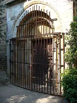Besondere Beachtung verdient das romanische Portal der Klosterkirche, das möglicherweise aus der Werkstatt des Meisters von Cabestany stammt; es ähnelt in Material, Aufbau und Stil aber auch dem Portal der nur etwa 10 km östlich gelegenen Kirche Sainte-Marie von Brouilla. Der dezent mit einem Ornamentband verzierte Rundbogen des ebenfalls aus hellem Marmor gefertigten Portals wird von vier Säulen mit Figurenkapitellen getragen. Die Figuren am zweiten Kapitell der linken Seite können als Darstellungen des römischen Kaisers Konstantin mit seiner Mutter Helena, der Schutzpatronin der nahen Stadt Elne, und der angeblich von ihr entdeckten Reliquie des Heiligen Kreuzes identifiziert werden. Die Figuren der übrigen Kapitelle stellen Tiere und Fabelwesen dar. Das Portal wurde im 17. Jahrhundert durch ein heute noch vorhandenes schmiedeeisernes Gittertor gesichert.