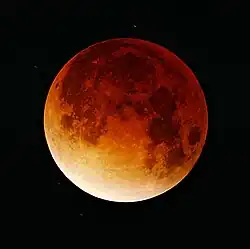 • die totale Mondfinsternis, bei der der Mond völlig in den Schatten der Erde wandert. Die Totalität dauert maximal etwa 106 Minuten. Bei einer totalen Mondfinsternis sollte wegen der Geometrie der Mond im Kernschatten der Erde liegen. Der Kernschatten sollte theoretisch knapp 1,4 Millionen Kilometer in den Raum reichen, tatsächlich reicht er aber wegen der starken Streuung durch die Erdatmosphäre nur etwa 250.000 km weit. Deshalb wird der Mond auch bei einer totalen Finsternis nicht völlig verdunkelt. Da die Erdatmosphäre die blauen Anteile des Sonnenlichts stärker streut als die roten, erscheint der Mond bei einer totalen Finsternis als dunkle rotbraune Scheibe; daher auch die gelegentliche Bezeichnung „Blutmond“.