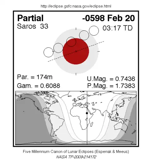 Unter Berücksichtigung des ΔT[3] begann die Mondfinsternis in Babylonien etwa um 0:45 Uhr des 20. Februar 599 v. Chr.[1] und erreichte gegen etwa 3:10 Uhr ihr Maximum. Die babylonische Keilschrifttafel ist stark beschädigt, weshalb nicht alle Daten erhalten geblieben sind: