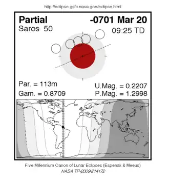 Unter Berücksichtigung des ΔT[3] begann die Mondfinsternis in Babylonien etwa um 4:00 Uhr des 20. März 702 v. Chr.[1] und erreichte um etwa 6:35 Uhr ihr Maximum. Der Schreiber des babylonischen Keilschrifttextes vermerkte die genaue Zeitangabe der Mondfinsternis: