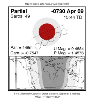 Unter Berücksichtigung des ΔT[4] begann die Mondfinsternis in Babylonien etwa um 09:55 Uhr des 9. April 731 v. Chr.[1] und erreichte um etwa 12:15 Uhr ihr Maximum. Die Hochrechnung weist eine große Genauigkeit bezüglich des tatsächlichen Eintritts der Mondfinsternis auf: