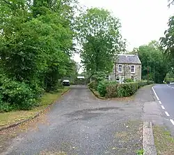 Die Ordnance-Survey-Karten zeigen, dass der erste Eingang von der Straße nach Auchentiber mit seiner Lodge Golconda aufgelassen wurde, vermutlich wegen Kalksteinarbeiten, und der heutige Eingang mit seiner eduardischen Monkredding Lodge als Ersatz gebaut wurde. Vor dem Bau der Fernstraße war der Eingang an der ehemaligen Straße von Kilwinning nach Beith bei Laigh Gooseloan, die weiter über Jameston und Drambuie führt.[16] Die Karte von Thomson von 1832 zeigt einen Zugang, der entlang der heutigen Straße direkt hinauf zum Haus verläuft.[17] Golconda ist eine Ruinenstadt im mittleren Süden von Indien, westlich von Hyderabad, und Hauptstadt eines alten Königreiches (ca. 1364–1512). Wie es zu der Benennung der Lodge kam, ist nicht bekannt.