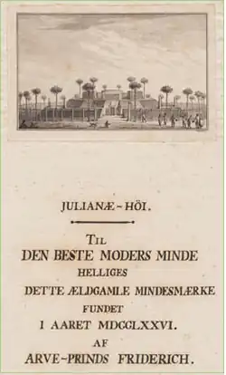 Im Jahr 1776 wurde der Monseshøj von Erbprinz Friedrich und seinem Kabinettssekretär Ove Høegh-Guldberg ausgegraben. Da man annahm, dass es sich um ein altes Königsgrab handelte, wurde beschlossen, den Hügel zum Nationaldenkmal zu machen. Der Bildhauer Johannes Wiedewelt löste die Aufgabe der Gestaltung, indem er den Hügel in eine terrassierte Anlage mit geschnittenen Hecken, Bäumen und sieben Marmorsäulen zum Gedenken an die sagenhaften „heidnischen Könige“ verwandelte. Der Eingang zum Grabmal wurde mit einem pompösen Marmorportal markiert. Das Ganze wurde von einem hohen Zaun umgeben. Der Name Julianehøj war eine Hommage an die Königswitwe Juliane Marie (1729–1796).