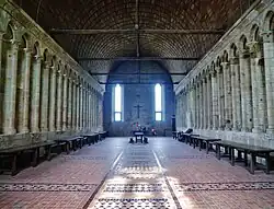 Der sogenannte Wandelsaal der Mönche entstammt dem späten 11. Jahrhundert und diente wohl ursprünglich als einfacher Kreuzgang. Ob die fünf monolithischen Mittelsäulen und das aufruhende Rippengewölbe allerdings zur originalen Bausubstanz gehören, ist eher unwahrscheinlich. Wenn es so wäre, gehörte das Gewölbe (neben Durham, Speyer und evtl. Lessay) zu den frühesten bekannten Rippengewölben des Mittelalters. Die Nordseite des Raumes hat mehrere kleine Fensteröffnungen mit abgeschrägten Laibungen zur besseren Belichtung. Oberhalb lag das ehemalige Dormitorium.