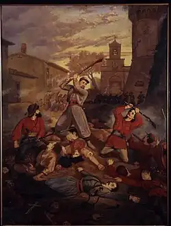 1867 fand hier ein blutiges Gefecht zwischen päpstlichen Zuaven und italienischen Aufständischen Garibaldis statt, das wegen seines dramatischen Verlaufs auch mehrfach in der zeitgenössischen Literatur erwähnt wird und von dem es ein Gedenkgemälde gibt. Am 13. Oktober sollte das befestigte und auf einer mit Weinbergen bewachsenen Anhöhe liegende Dorf Montelibretti von dem Papstsoldaten genommen werden. Entgegen ersten Annahmen war es von Garibaldis „Rothemden“ stark besetzt. Eine Zuavenkompanie – 90 Mann – griff gegen Abend an. Nach einem kurzen Vorpostengefecht kam es zu erbittertem Nahkampf, da die Papstsoldaten bis zum Festungstor stürmten und sogar in das Dorf eindrangen. Beide Führer der Kompanie fielen. Die zahlenmäßig unterlegenen Zuaven kämpften wie die Löwen und wurden schrecklich dezimiert. Der Feldwebel Joseph Alois Bach riss selbständig die Initiative an sich, übernahm das Kommando und feuerte seine Kameraden rastlos zum Kampf an, bis er die Unmöglichkeit des weiteren Vordringens einsah. Schließlich sammelte er die Truppe in einem Haus, hart an der Stadtmauer, verschanzte sich dort und leistete die ganze Nacht erbitterten Widerstand, ständig bedroht von der vielfachen Übermacht des Gegners. Am Morgen zählte er neben vielen Toten und Verwundeten noch 16 kampffähige Männer, stellte jedoch überrascht fest, dass der Feind sich – offenbar infolge der heftigen Gegenwehr – unerwartet zurückgezogen hatte. Erst jetzt traf sein Bataillon zur Unterstützung ein. Als Bach Meldung machte, wurde der Bataillonschef Oberstleutnant Athanasius Baron de Charette vom Mut der führerlosen Schar so sehr ergriffen, dass er salutierend seinen Säbel vor ihr senkte und das ganze Bataillon an den 17 nächtlichen Verteidigern des Monte Libretti vorbeidefilieren ließ. Er veranlasste, dass Joseph Alois Bach, per Telegramm, noch auf dem Schlachtfeld zum Offizier befördert und mit dem Ritterkreuz des St. Silvesterordens ausgezeichnet wurde. In der Publikation „Die Streiter für den apostolischen Stuhl im Jahre 1867“ (Verlag für Kunst und Wissenschaft, Frankfurt, 1867) zitiert der Verfasser, Pater Andreas Niedermayer, einen Augenzeugen mit den Worten: „Sergeantmajor Joseph Bach sah aus, wie im Blute gebadet, obgleich er selbst nicht die geringste Schramme hatte. Tags darauf konnte er an seine Eltern in der Bayerischen Rheinpfalz telegraphieren: ‚Seppel wohl und gesund, auf dem Schlachtfeld Offizier geworden.’ “ In der Heimat veranstalteten die Pfälzer Katholiken daraufhin eine Sammlung und stifteten dem berühmten Landsmann in päpstlichen Diensten einen wertvollen Ehrensäbel.
