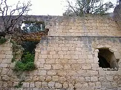 Das nächste Gebäude ist weitgehend zerfallen. Im Untergeschoss liegt eine Zisterne. Dahinter schließt ein bogenförmiger Mauerabschnitt die Kernburg ab. Er grenzt an einen kleineren Torturm, der wohl der eigentliche Hauptzugang war. Das etwa 17 Meter hohe Bauwerk ist als nach innen offener Schalenturm angelegt.